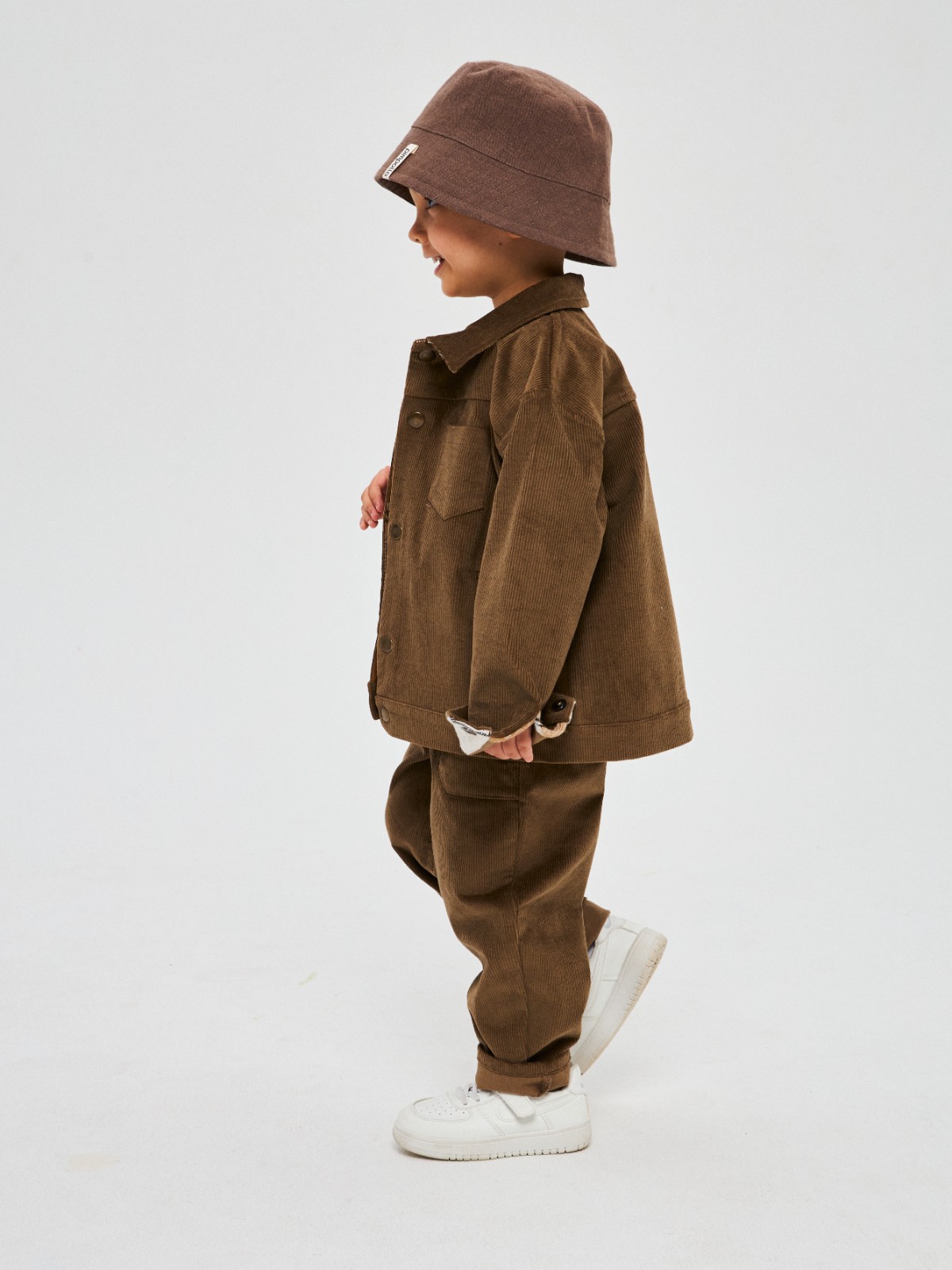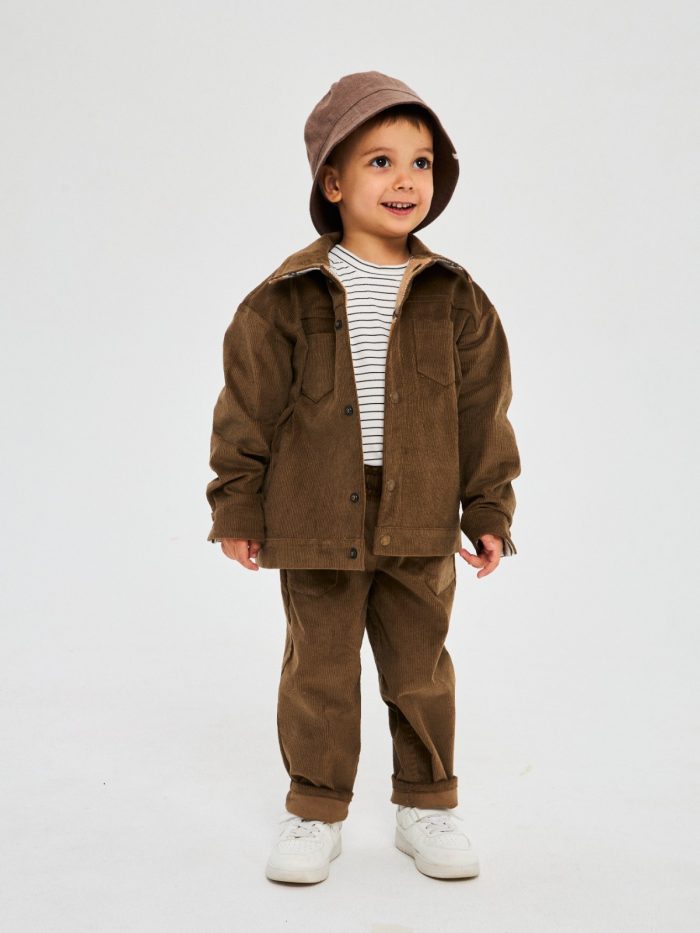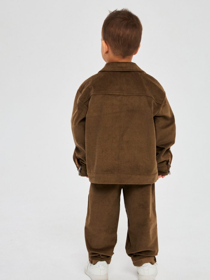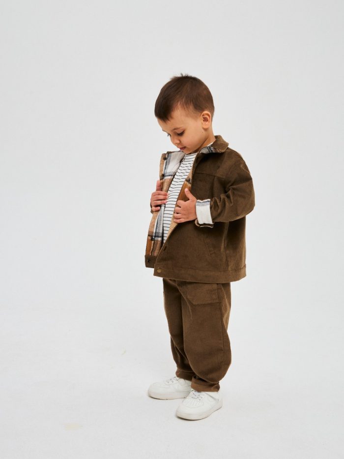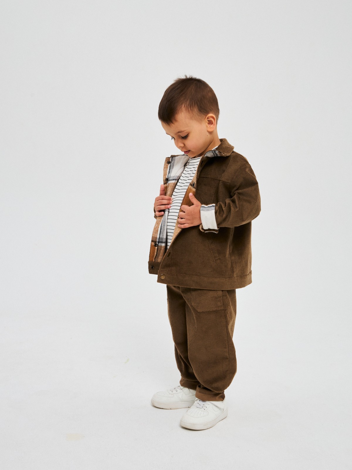 Куртка из хлопкового вельвета на кнопках, декорирована клетчатой тканью, без подкладки. Выполнена из натуральной, прочной, устойчивой к деформациям ткани. Имеет мягкую и бархатистую поверхность. Температурный режим +10 до +20 °С.