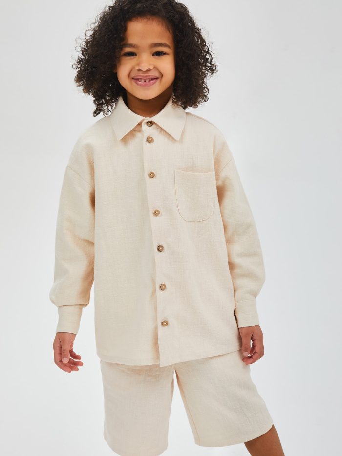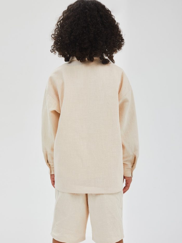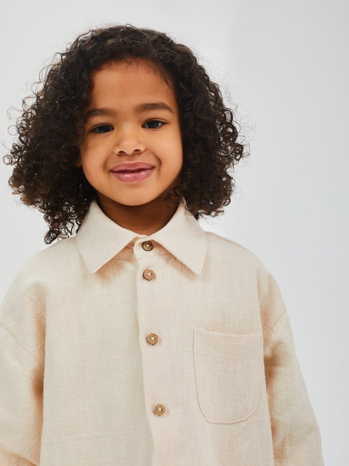 Детская рубашка свободного кроя с пуговицами из кокоса. Ткань из крапивы сорта Рами, считается премиальной. По характеристикам схожа с натуральной льняной тканью, при этом она более износостойкая и плотная. Одежда из крапивы не так сильно мнётся и при сушке в расправленном виде можно обойтись без глажки. В очень тёплую погоду в такой одежде ребёнку будет не жарко, а в прохладное время она будет согревать. Одежда из крапивы подходит для повседневного использования, а также прекрасно впишется в праздничный образ. В прохладные времена года рубашку из крапивы можно носить как второй слой, надевая поверх футболки или лонгслива.